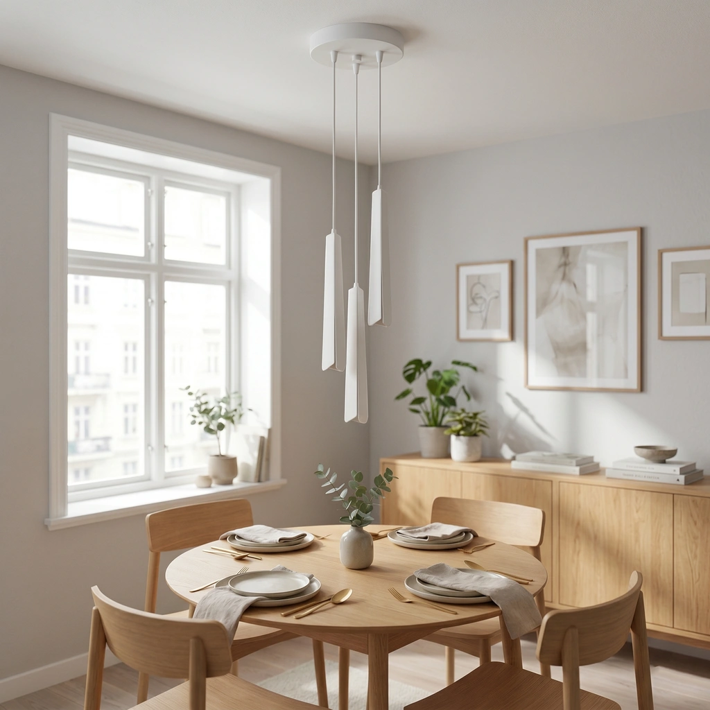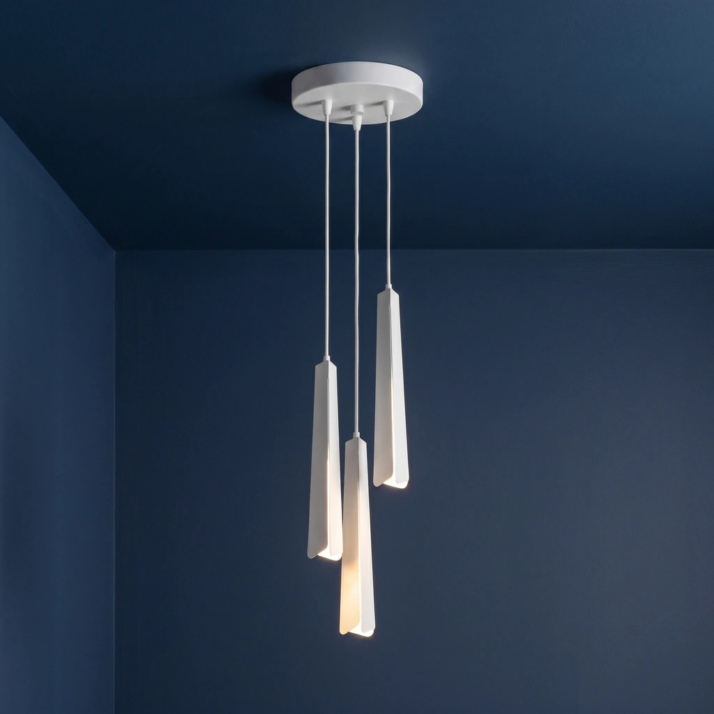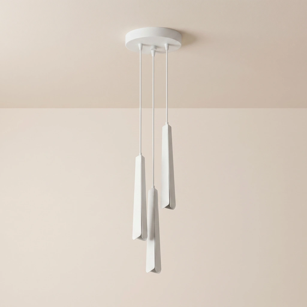 La suspension HELIORA joue la carte de l’élégance graphique avec ses trois tubes fins en acier blanc mat. Suspendus en grappe depuis une base circulaire, ils créent un volume léger et aérien.