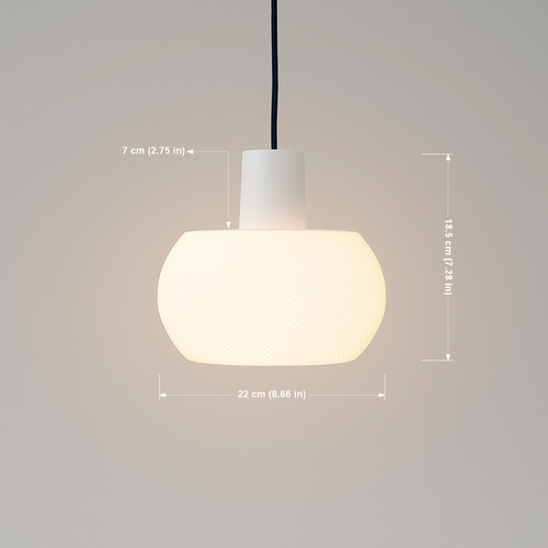 Forme sphérique délicatement texturée – effet hypnotique garanti Matière éco-responsable : biopolymère végétal 100 % recyclable et biodégradable (acide polylactique) Douille E27 – compatible uniquement ampoules LED (ampoule non fournie) Câble textile noir ou blanc – longueur ≈ 1,5 m (réglable) Poids plume : seulement 400 g Dimensions : Ø 22 × 18,5 cm