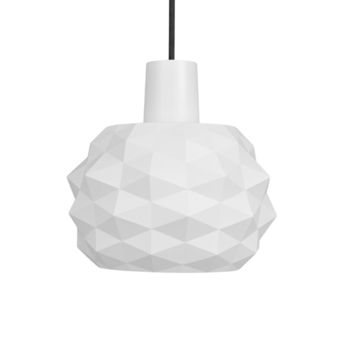 Forme polygone à facettes – jeux de lumière hypnotiques Matière éco-responsable : biopolymère végétal 100 % recyclable et biodégradable (acide polylactique) Douille E27 – compatible uniquement ampoules LED (ampoule non fournie) Câble textile noir ou blanc – longueur ≈ 1,5 m (réglable) Poids plume : seulement 400 g Dimensions : Ø 25 × 23 cm