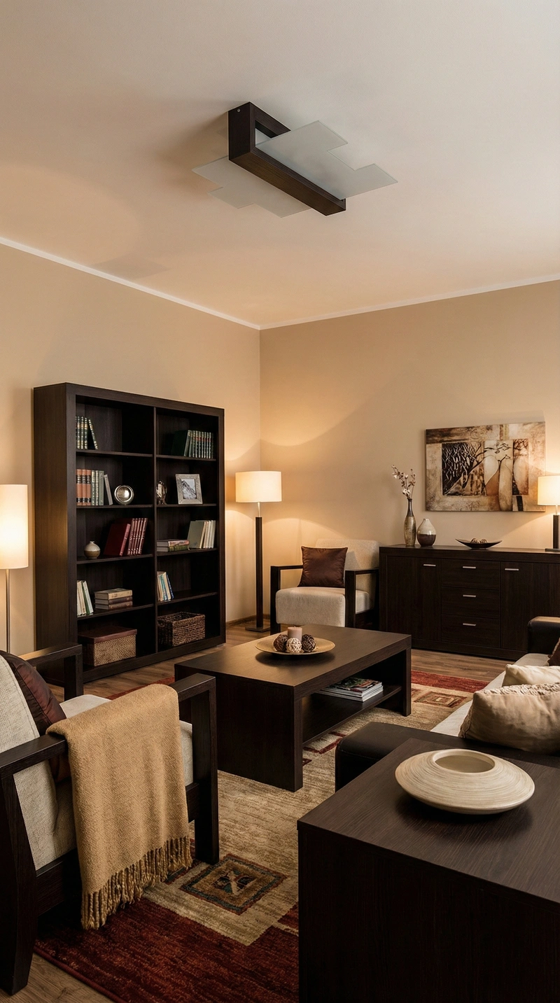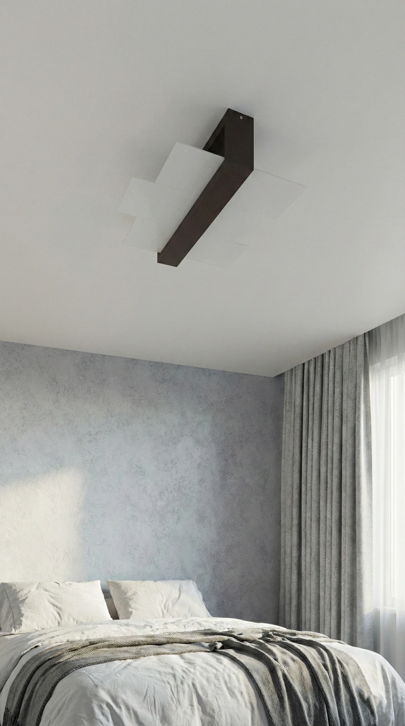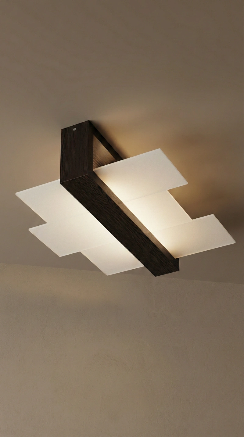 Le plafonnier UMBRA joue sur le contraste raffiné entre un cadre en bois wengé sombre et un large diffuseur en verre mat.